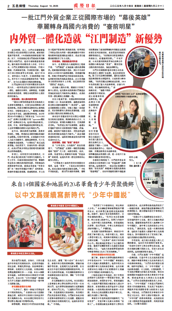 漫步崖门古炮台、京梅村,于历史遗迹中探寻岁月沉淀的故事;走进梁启超故居纪念馆,聆听先贤事迹;探访华侨华人博物馆、长堤历史文化街区,在展品与街巷间追溯侨乡往事……日前,来自14个国家和地区、20所华校的20名华裔青少年齐聚江门,在2025年“少年中国说”华裔新生代中文朗诵大赛研学营里共赴一场中华文化体验之旅。