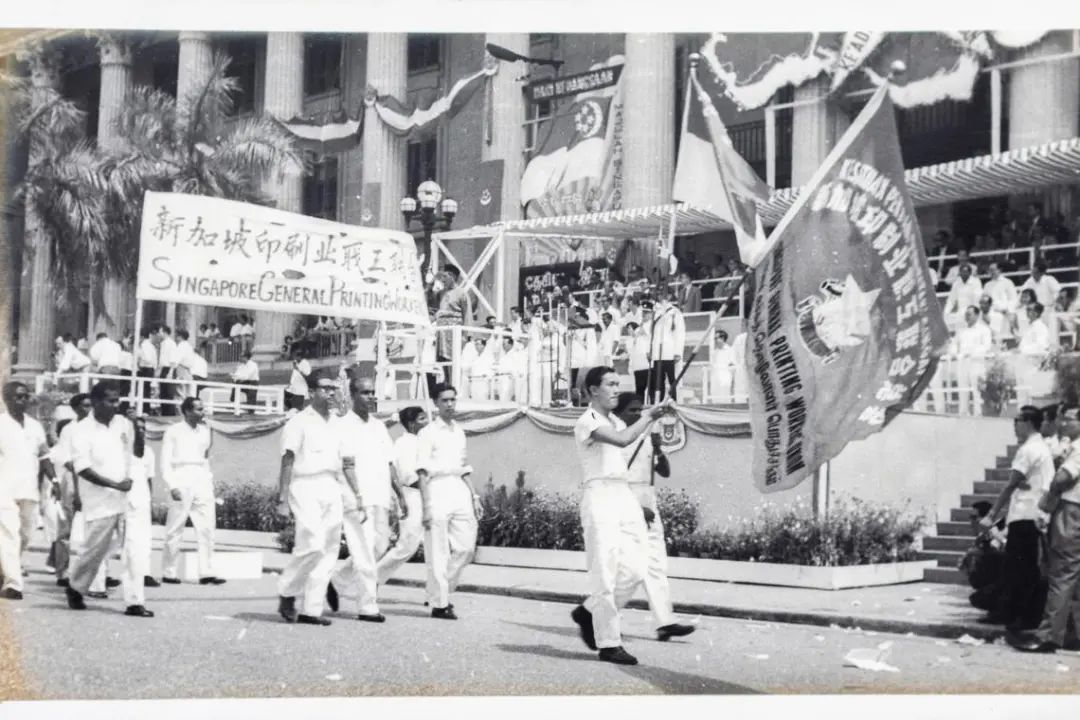 郑社心(第二排右一)和新加坡印刷业职工联合总会代表,1961年参与第一届新加坡邦庆。(受访者提供)