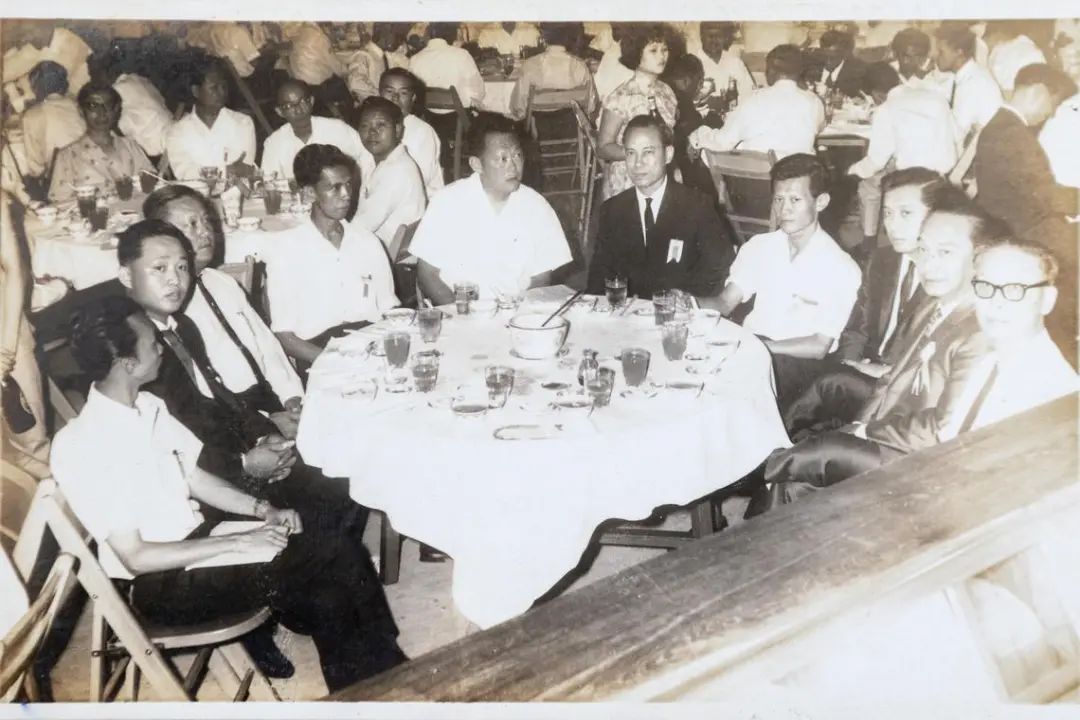 1965年4月新加坡印刷厂商暨工会代表大会,郑社心(左四)代表劳方向时任总理李光耀(左五)传达民声,打领带的皆是资方。(受访者提供)