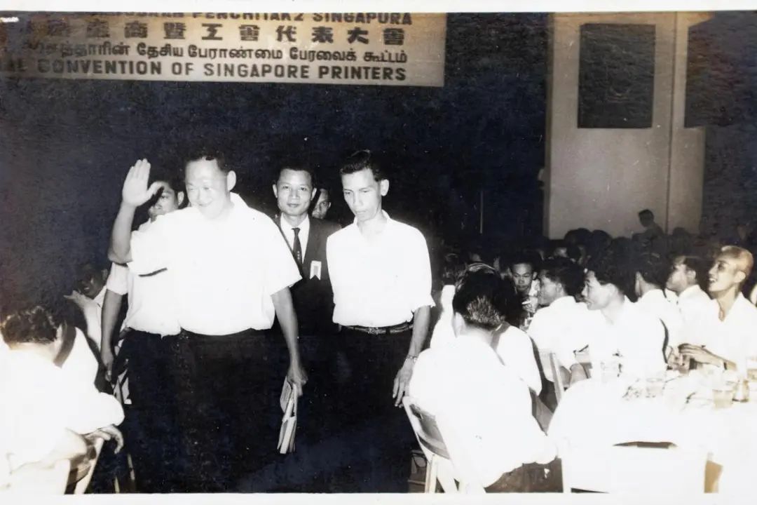 时任总理李光耀出席新加坡印刷厂商暨工会代表大会,郑社心(右)作为劳方代表,跟随在后。(受访者提供)
