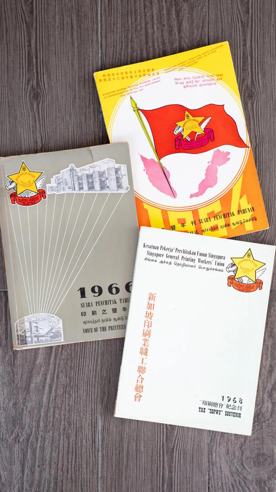 新加坡印刷业职工联合总会1964、1966和1968年出版的纪念特刊,郑社心保留至今。(特约李姿仪摄)