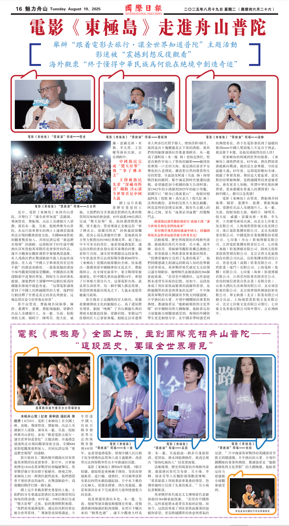 近日,电影《东极岛》来到舟山普陀,并举行了“让全世界知道”云路演。导演管虎、费振翔,出品人及总制片人梁静,演员朱一龙、吴磊、倪妮齐聚舟山普陀,在这片故事发生的热土上通过云连线与北京场的观众深度交流,全国888家影院的观众惊喜加入,共同见证这场“重返历史现场”的感动。这部取材于83年前中国渔民冒死营救英军战俘真实事件的作品,让不少观众在观影过程中屡屡热泪盈眶。有人为渔民们在惊涛骇浪中救人的血性而感染,有人为“中国人字典里从没有见死不救”的担当而动容。一幕幕震撼的画面令海外观众同样深受触动,中国渔民在惊涛骇浪中迸发的勇气、对陌生生命的无私救援,让他们终于读懂——这个民族为何总能在绝境中创造奇迹,“这部电影让我看到了中国人民跨越国界的大爱,他们用行动诠释了什么是真正的善良与担当,这种品质在当今世界无比珍贵”。