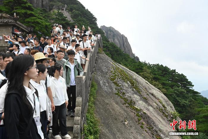 8月12日,“徽风探源——2025华裔大学生中国文化体验营”走进安徽黄山风景区,学生们通过脚步丈量自然之美,沉浸式感受黄山生态与人文交织的独特魅力。图为华裔学生用手机记录黄山景色。中新社记者 韩苏原 摄