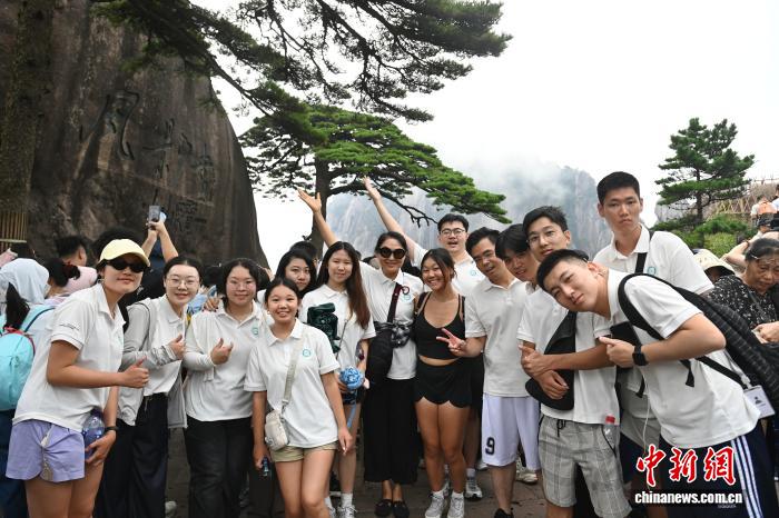 图为华裔学生们在黄山风景区迎客松观景台前合影。中新社记者 韩苏原 摄
