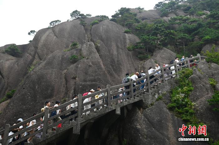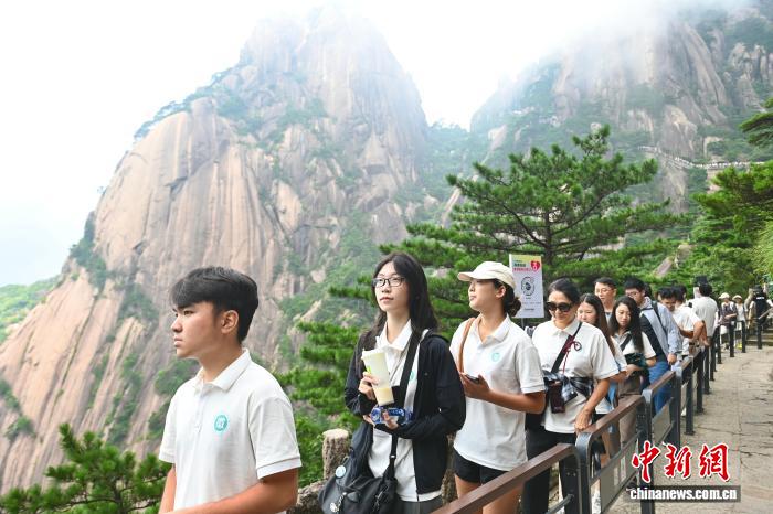图为华裔学生们漫步在黄山风景区,脚下是蜿蜒的山路,身旁是奇松怪石与缭绕云雾。中新社记者 韩苏原 摄