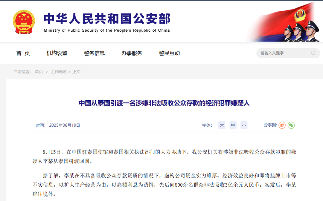 据中国公安部微信公众号8月19日消息,在中国驻泰国使馆和泰国相关执法部门的协助下,中国公安机关15日将涉嫌非法吸收公众存款犯罪的李某从泰国引渡回中国。
