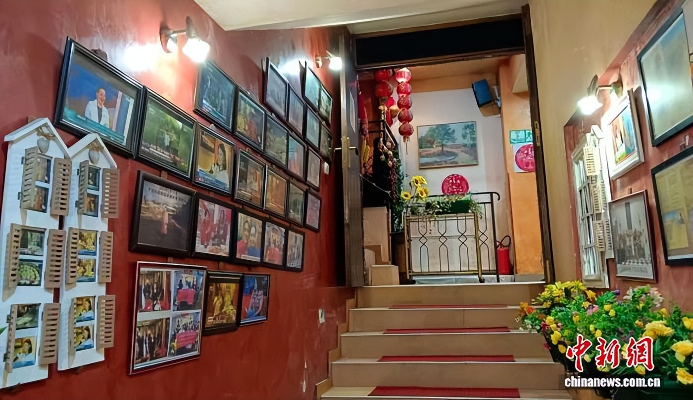 塞尔维亚侨商杨芳霞在贝尔格莱德的功夫餐厅走廊上挂满照片,记录她和食客的友谊。(受访者供图)