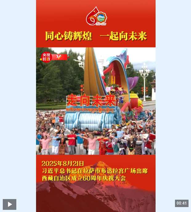 中國新聞亮點關注 独家视频丨同心铸辉煌 一起向未来 2025 年 8 月 21 日 21日上午,习近平总书记在拉萨市布达拉宫广场出席西藏自治区成立60周年庆祝大会,同西藏各族各界干部群众约2万人共同欢聚,热烈庆祝西藏自治区成立60周年。 各族群众身着绚丽多彩的服饰,跳起热情欢快的舞蹈,表达过上幸福生活的喜悦之情、对党和国家的感恩之情。当“走向未来”造型彩车行进到主席台前时,习近平总书记同大家亲切挥手致意。 至深的情感、不变的初心,雪域高原见证习近平总书记的亲切关怀。
