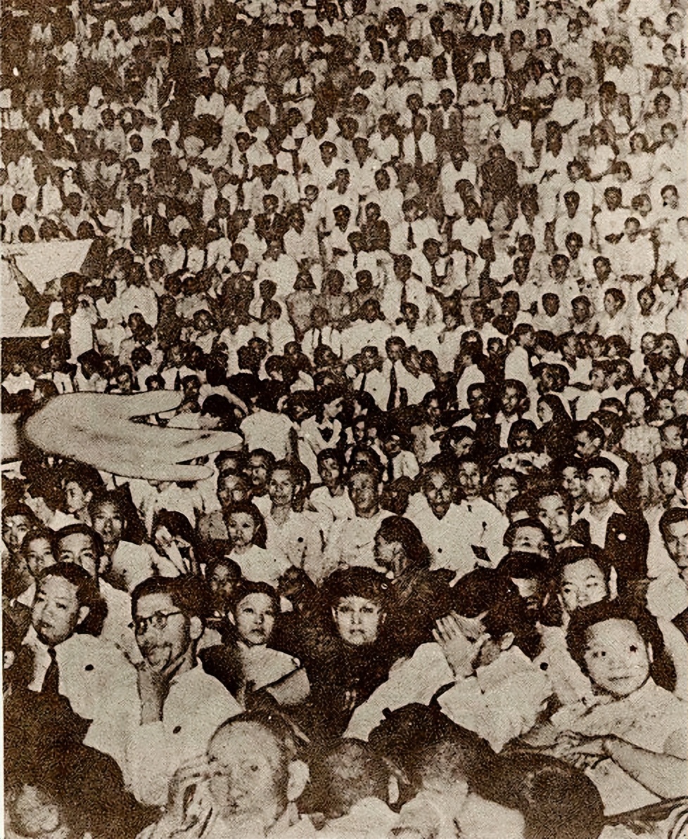 老照片反映出抗日赈灾剧吸引众多马来西亚民众观剧。受访者供图
