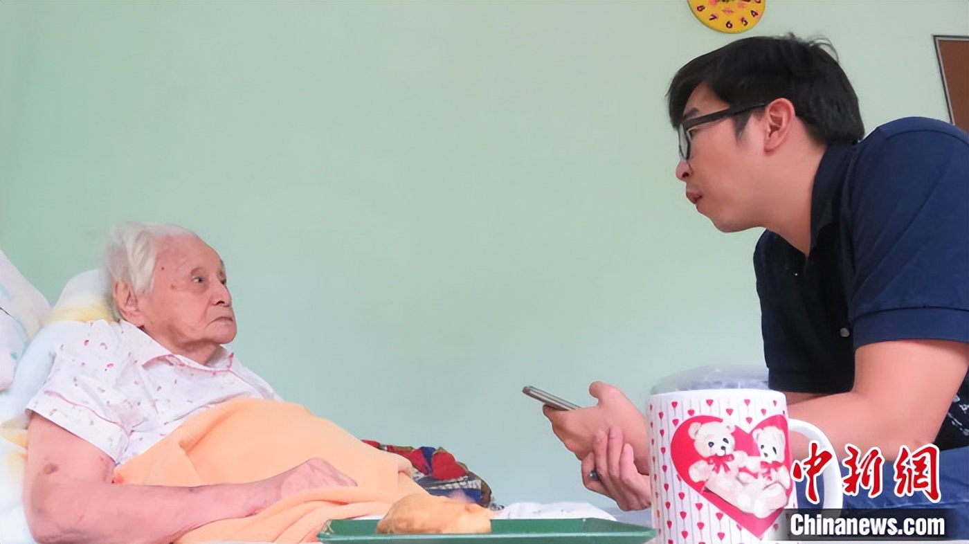 时年99岁的原马来西亚雪兰莪州加影前卫剧社演员刘柏星(左)接受沈国明(右)访谈,回忆演剧支持抗战的青春岁月。 受访者供图