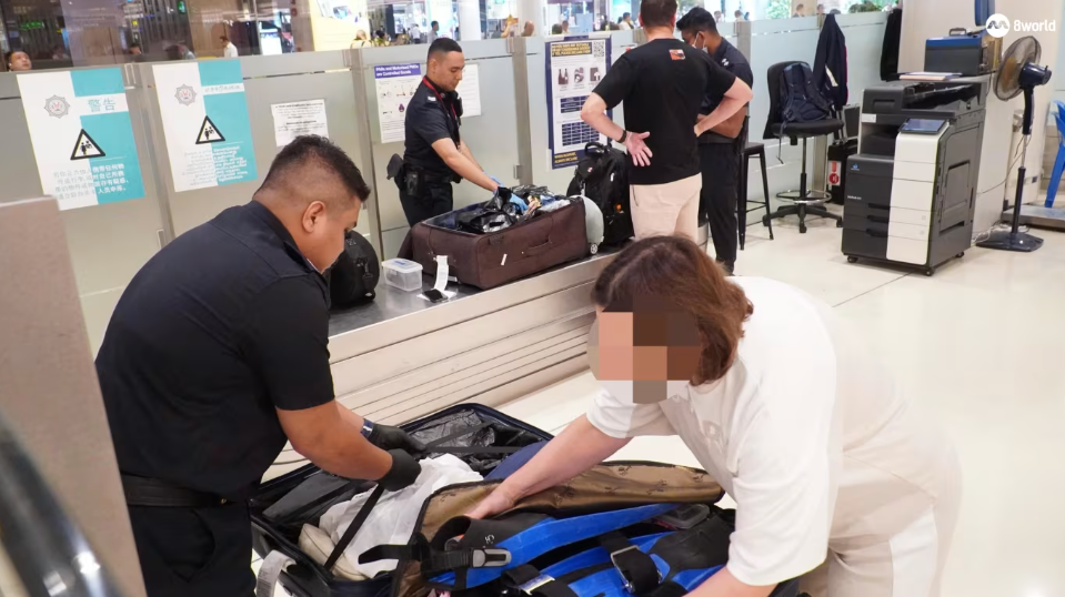 旅客领取托运行李后,移民局人员随机询问是否携带电子烟,并在X光扫描中识别可疑物品。