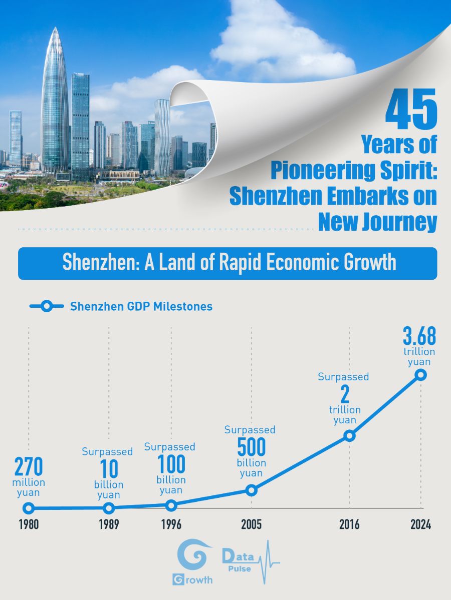Through 45 years of relentless efforts, Shenzhen has become a glittering embodiment of the Chinese Miracle with its remarkable developmental achievements. Shenzhen’s regional GDP soared from just 270 million yuan in 1980 to over 3.68 trillion yuan in 2024, marking a staggering increase of more than ten-thousand-fold. What was once a “small fishing village” has metamorphosed into a modern metropolis with global influence. Along the way, Shenzhen has continuously redefined the “Shenzhen Speed” with its pioneering spirit and down-to-earth ethos of “Time is money, efficiency is life.” The city stands as a vivid testament to the transformative power of China’s reform and opening-up. Let’s dive deeper into Shenzhen’s extraordinary economic leap through key figures.