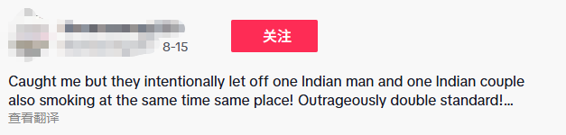 他被执法人员抓到在指定区域外吸烟,但他称执法人员只对他进行了罚款而放走了另外三名同样不在吸烟区吸烟的印度人。