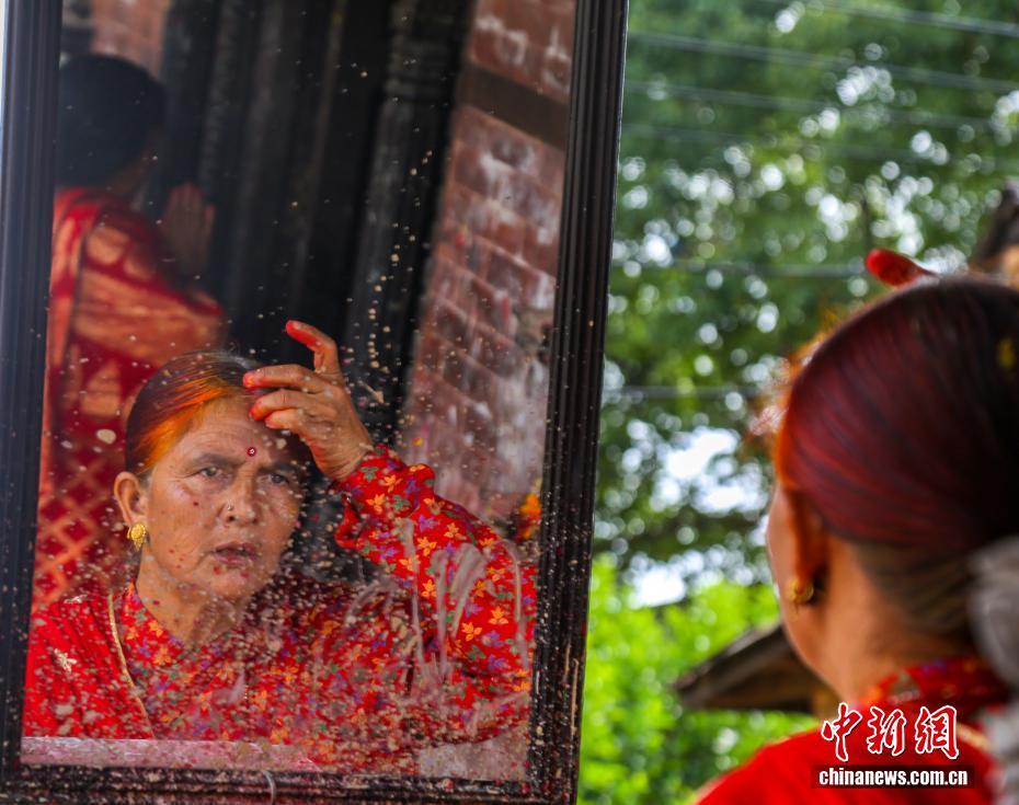 8月26日,尼泊尔加德满都谷地城市勒利德布尔,身着红色纱丽的妇人对镜整理妆容。当日,尼泊尔民众迎来“女人节”(TheTeej)。尼泊尔女性通常在这一天身穿红色纱丽前往当地的庙宇,以唱歌、跳舞、点灯祈福及斋戒(通常滴水不进)的形式祈福。中新社发 普拉丹 摄