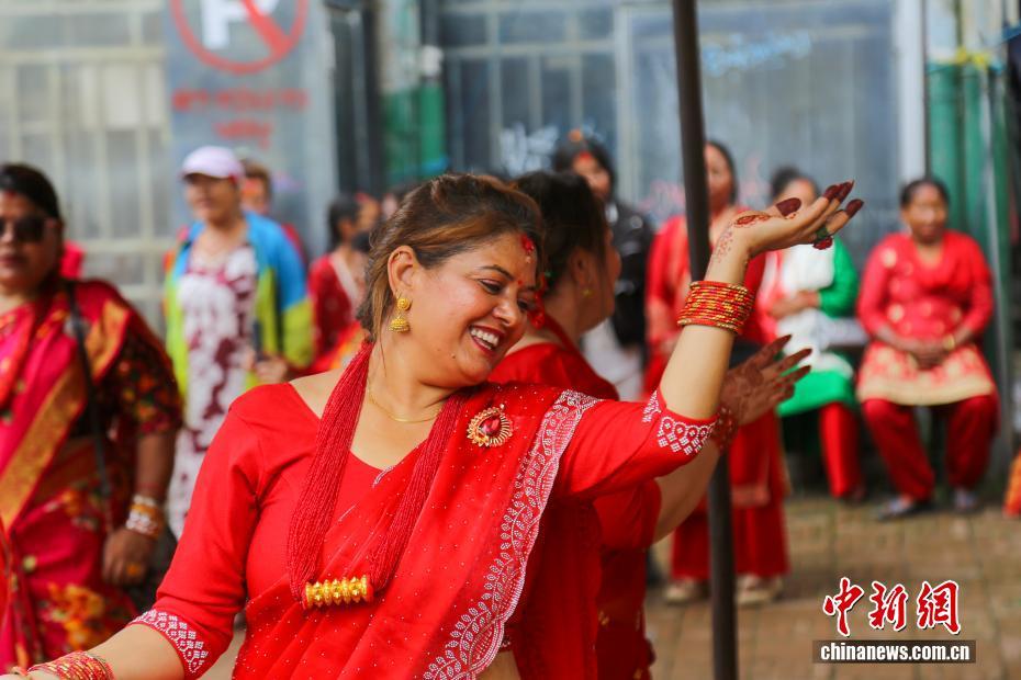 8月26日,尼泊尔加德满都谷地城市勒利德布尔,身着红色纱丽的女性载歌载舞。当日,尼泊尔民众迎来“女人节”(TheTeej)。尼泊尔女性通常在这一天身穿红色纱丽前往当地的庙宇,以唱歌、跳舞、点灯祈福及斋戒(通常滴水不进)的形式祈福。中新社发 普拉丹 摄