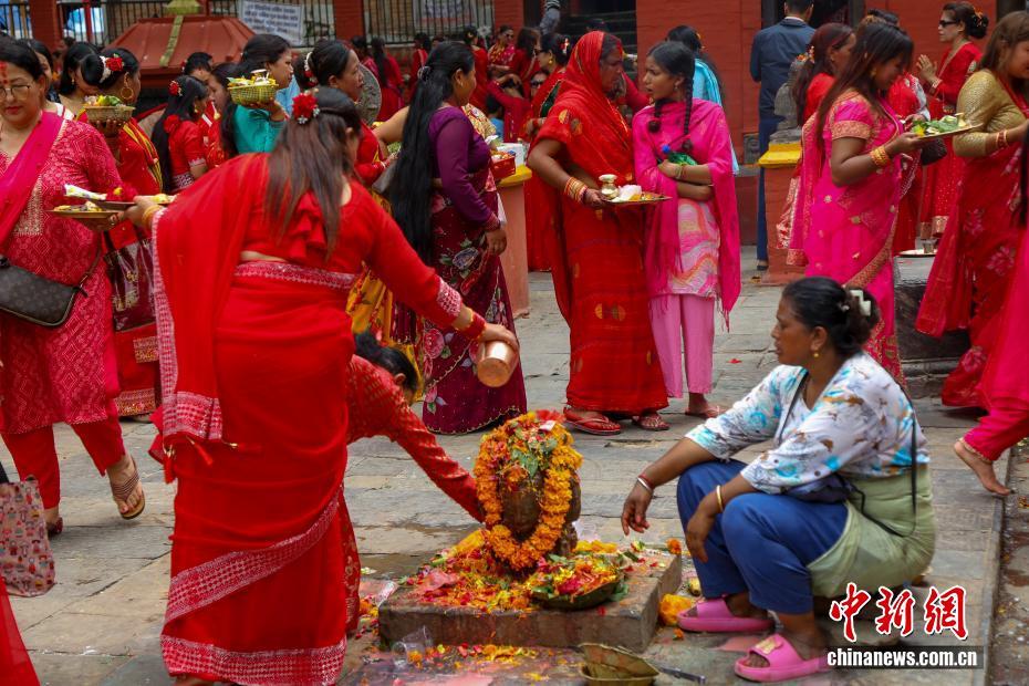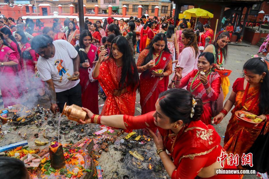 8月26日,尼泊尔加德满都谷地城市勒利德布尔,众多尼泊尔女性身着红色纱丽到当地庙宇中祈福。当日,尼泊尔民众迎来“女人节”(TheTeej)。尼泊尔女性通常在这一天身穿红色纱丽前往当地的庙宇,以唱歌、跳舞、点灯祈福及斋戒(通常滴水不进)的形式祈福。中新社发 普拉丹 摄