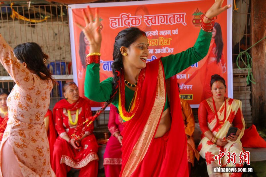 8月26日,尼泊尔加德满都谷地城市勒利德布尔,身着艳丽纱丽的女子载歌载舞。当日,尼泊尔民众迎来“女人节”(TheTeej)。尼泊尔女性通常在这一天身穿红色纱丽前往当地的庙宇,以唱歌、跳舞、点灯祈福及斋戒(通常滴水不进)的形式祈福。中新社发 普拉丹 摄
