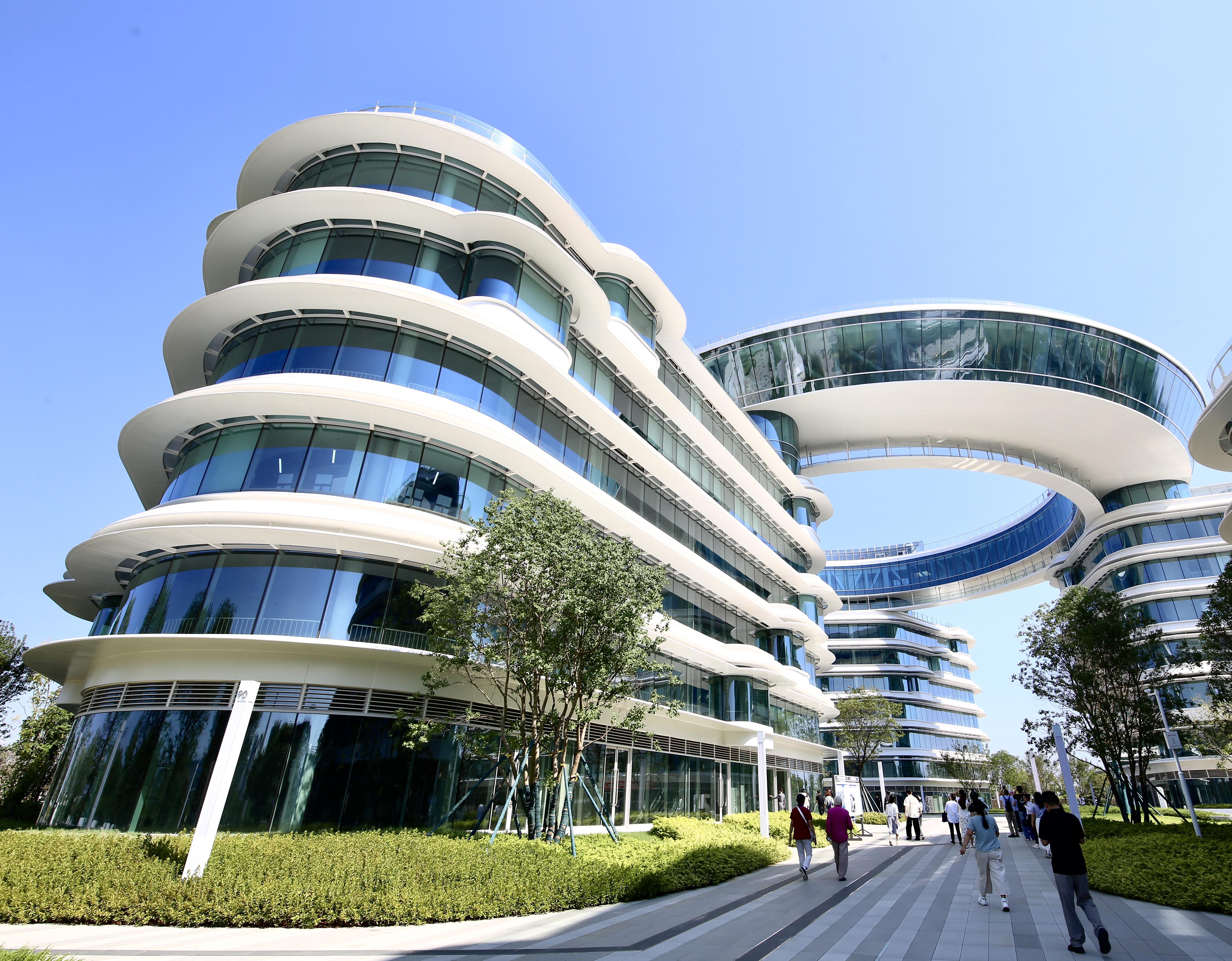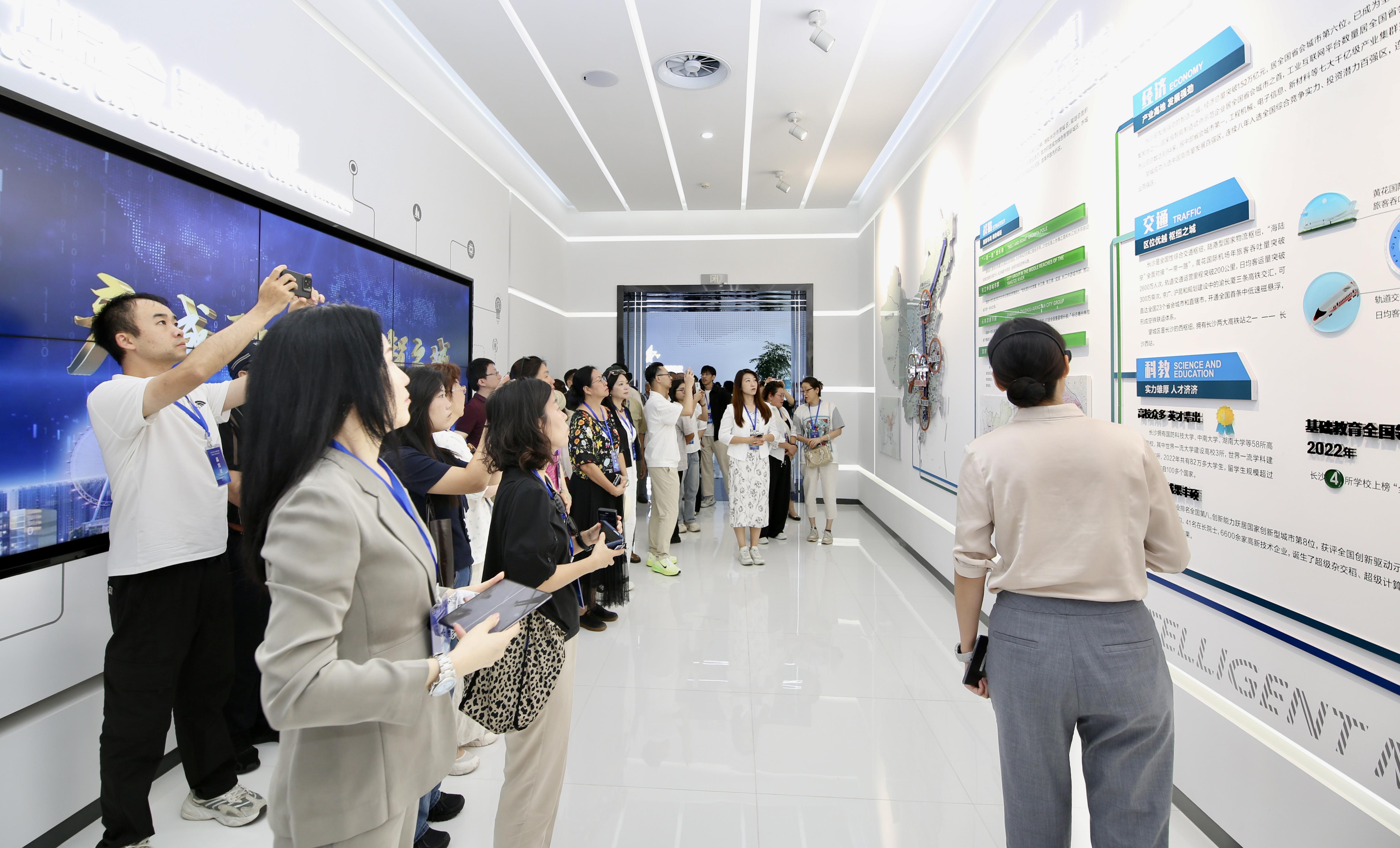 採訪團一行還登上三塔連體、大跨度純鋼結構的「天空之環」,站在這巨大的圓形玻璃走廊上,俯瞰海歸小鎮的全貌,彷彿一幅凝聚着科研與夢想的瑰麗畫卷在海外華媒高層面前徐徐展開。