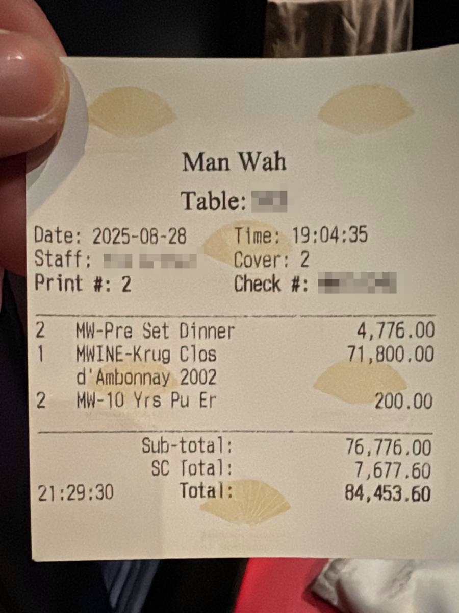另外,帐单2个茶位为两份10年普洱,合共索价200元,再加上开了一支价值超过7万元超名贵香槟Krug Clos d’Ambonnay,最后计上约7677元加一服务费,令帐单随即破8万元。