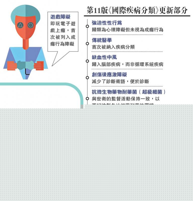 《国际疾病分类》是世卫颁布的国际统一疾病分类标準,广泛应用于帮助医生诊断疾病,以及保险公司衡量医疗保险的赔偿金额。第11版《国际疾病分类》根据全球各地医学专家的建议于2018年起草,本月25日在世界卫生大会期间获得通过。