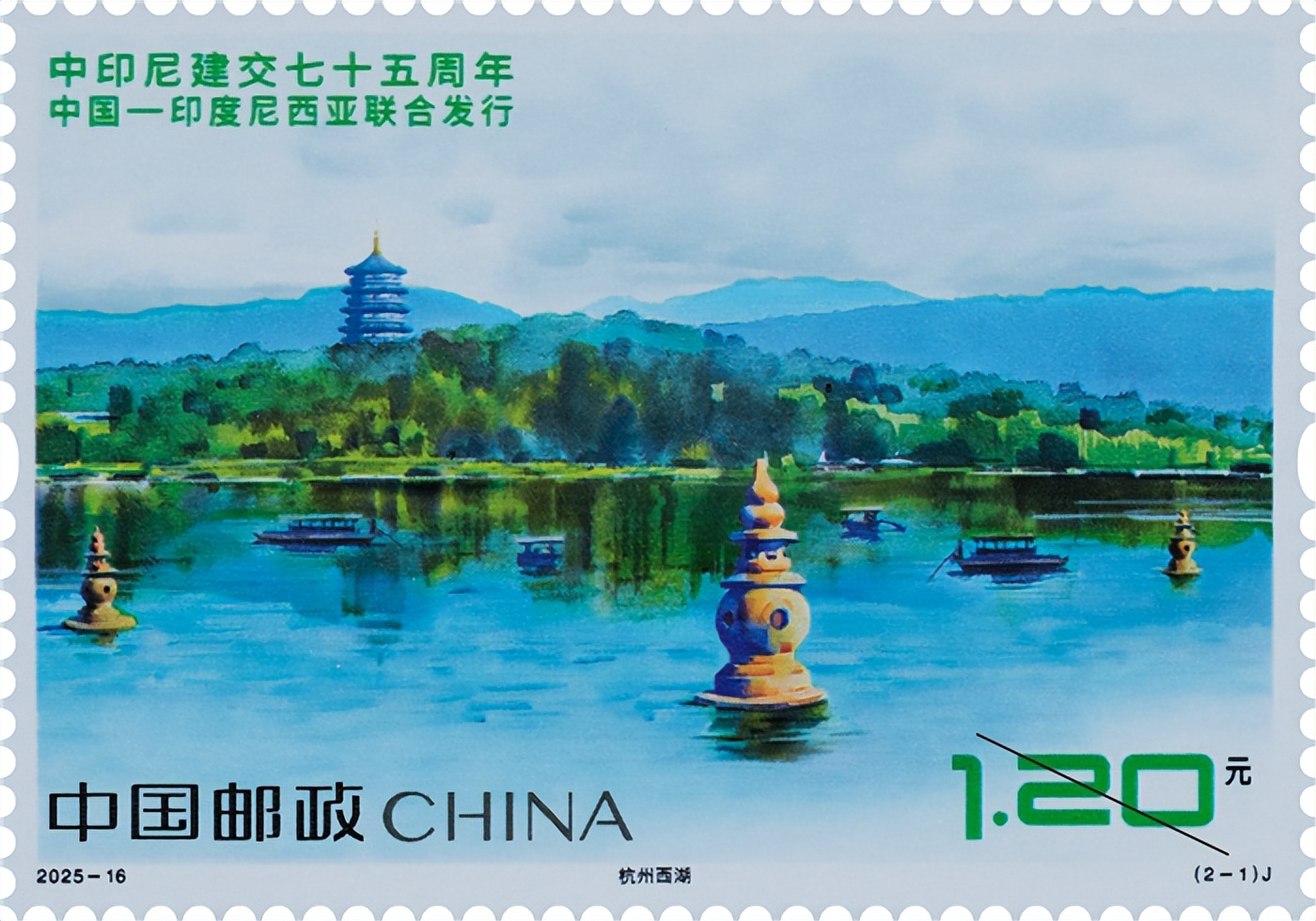 据了解,本次与印度尼西亚联合发行的《中印尼建交七十五周年》纪念邮票1套2枚,邮票图案名称为:杭州西湖、布拉坦湖。全套邮票面值2.40元,计划发行数量450万套。邮票第一图表现内容为杭州西湖。杭州西湖是中国历史上的“文化名湖”,也是享誉中外的“人间天堂”,以秀丽的湖光山色、悠久的历史、深厚的文化内涵以及丰富的文化史迹闻名世界,被联合国教科文组织列入《世界遗产名录》。