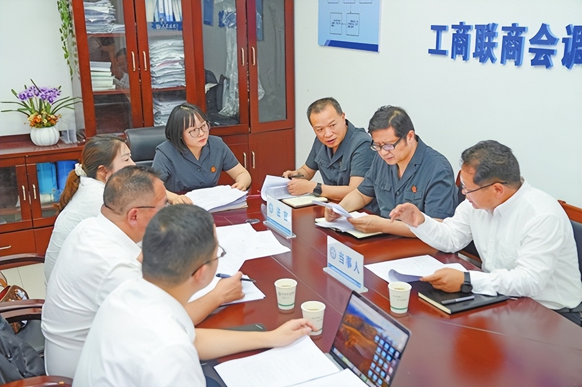图为安徽省滁州市中级人民法院、滁州市商务局领导和张倩法官(左四)组织调解。商仑 摄