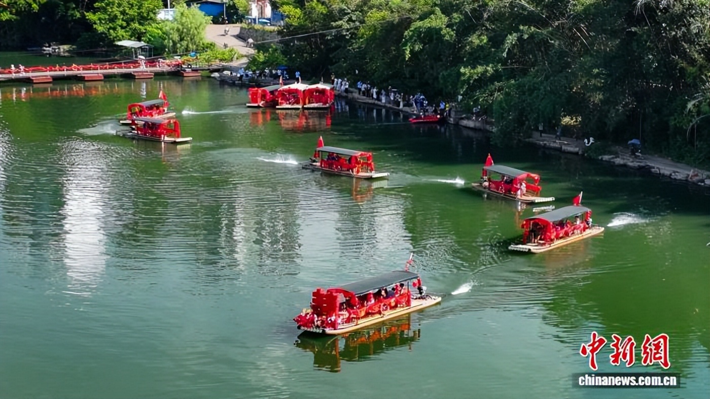 农历七月初七是中国传统七夕节。8月30日,在中国最年轻的瑶族自治县——广西桂林市恭城瑶族自治县茶江河上,一场主题为“瑶韵七夕·情定瑶乡”的水上婚礼上演。当天,一支身着瑶族盛装服饰的迎亲队伍,抬着花轿、挑着嫁妆,在热闹的唢呐锣鼓声中,走过街巷,登上张灯结彩的喜船沿江而下,进行水上婚礼巡游展示。