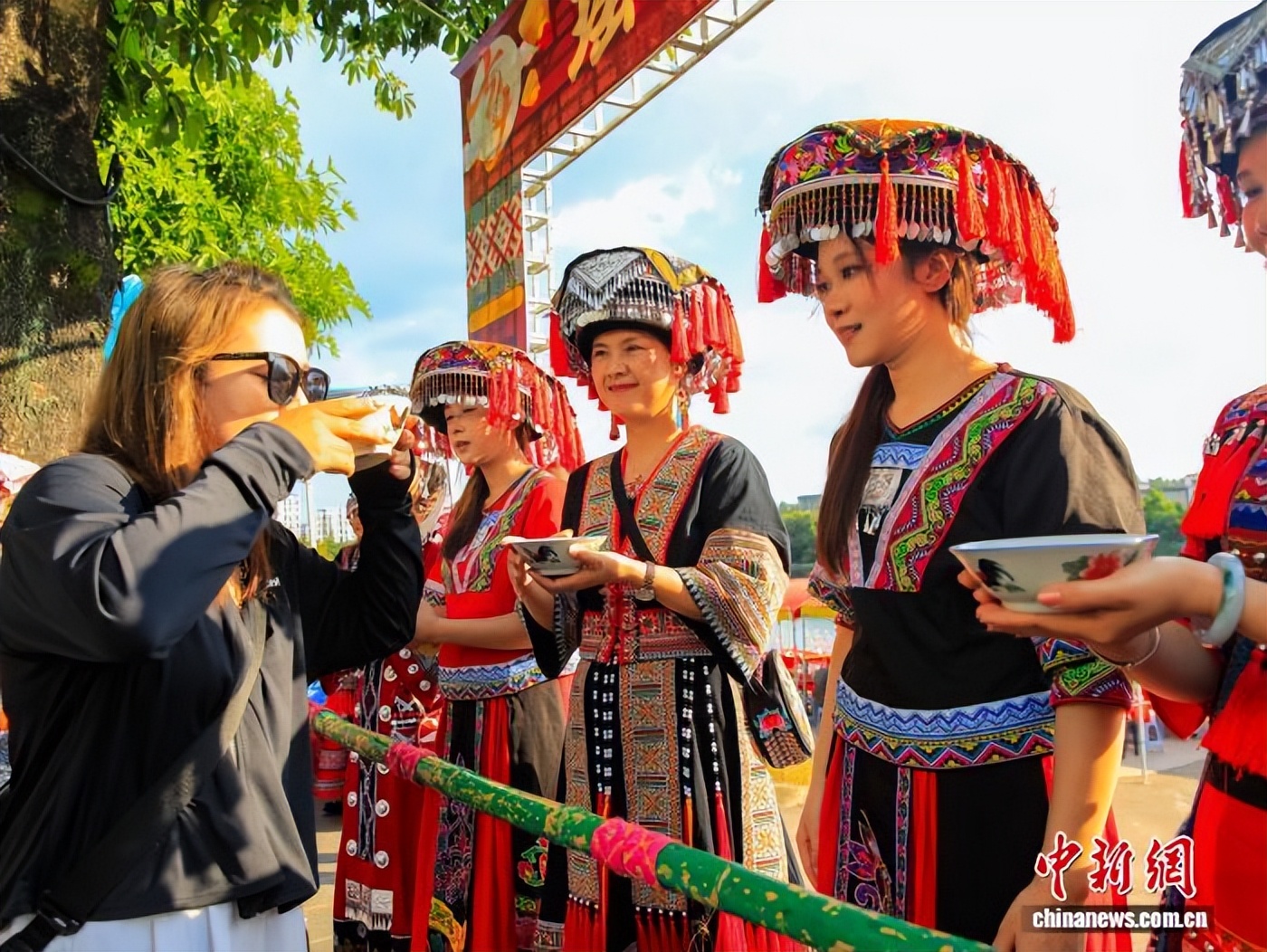 8月30日,游客喝拦门酒入场参加瑶族“凑份子”婚宴。杨宗盛 摄