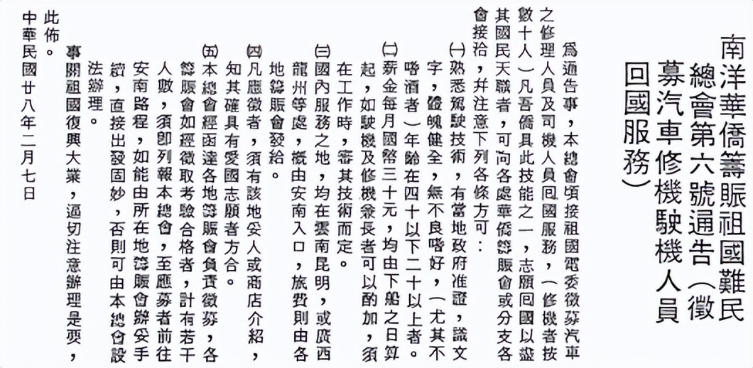 《南洋华侨筹赈祖国难民总会第六号通告》(征募汽车修机驶机人员回国服务)