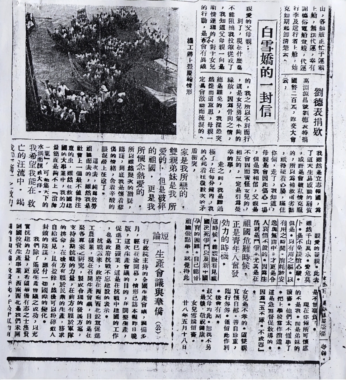 1939年5月19日,马来西亚《光华日报》刊登的白雪娇家书。