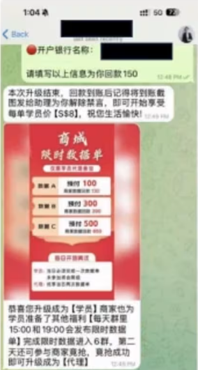 一旦受害人放松警惕,诈骗分子便诱导其参与“高报酬任务”,要求其在虚假网站注册账户,并通过PayNow向指定银行账户或加密钱包转账。随着转账金额逐渐增加,部分受害者甚至被要求线下见面,将现金当面交给陌生人。