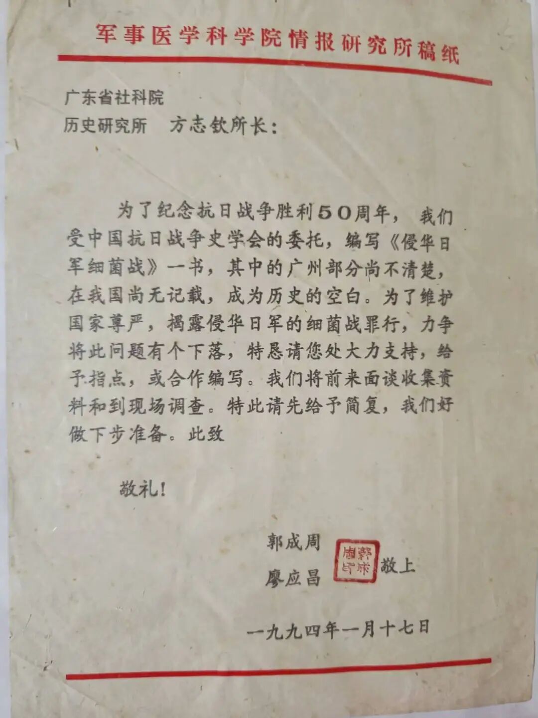 广东省社科院历史研究所收到中国人民解放军军事医学科学院专家郭成周、廖应昌的来信,告知正在编写《侵华日军的细菌战》,希望派人配合调查广东的情况。