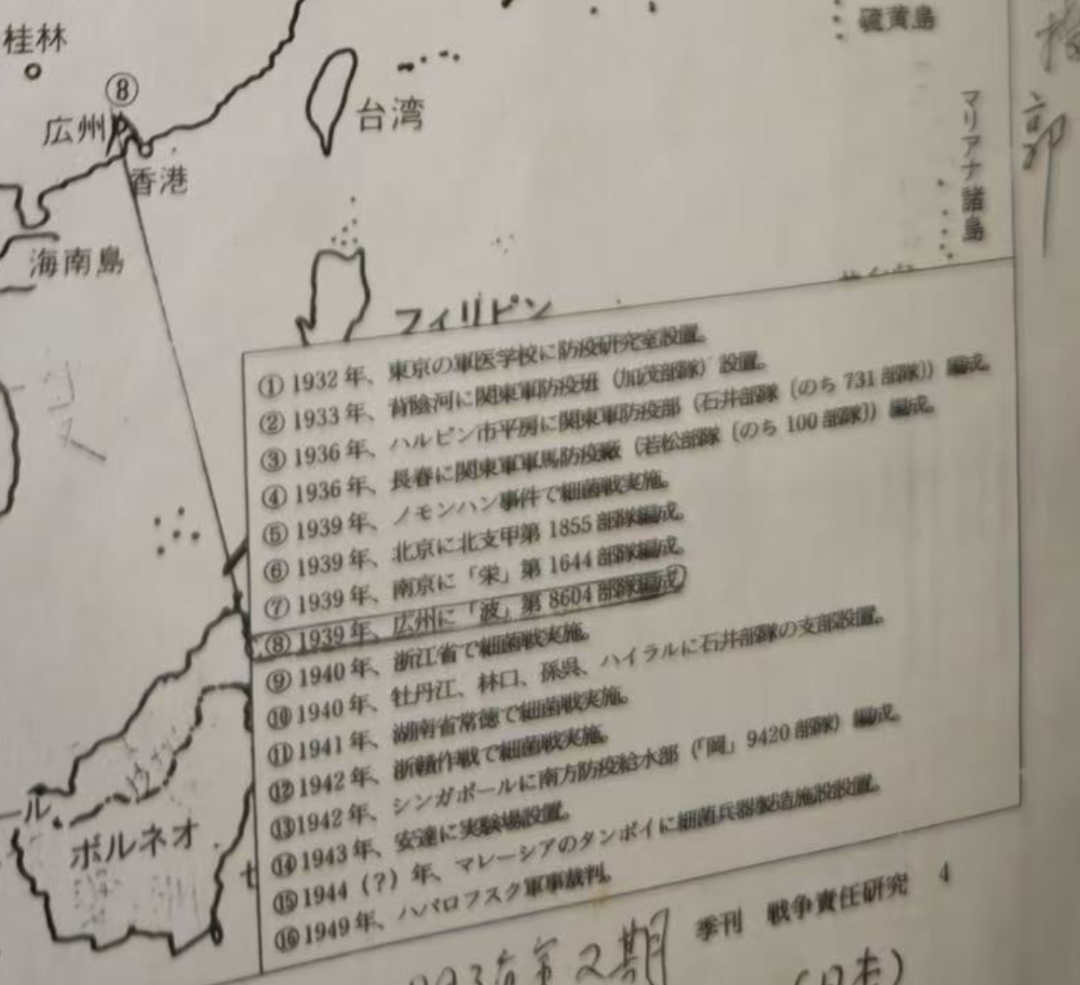 一份是《旧日本军细菌战部队关系图》,显示除了有在东北地区臭名昭著的“731部队”外,日军1939年还在广州成立了“8604”部队;