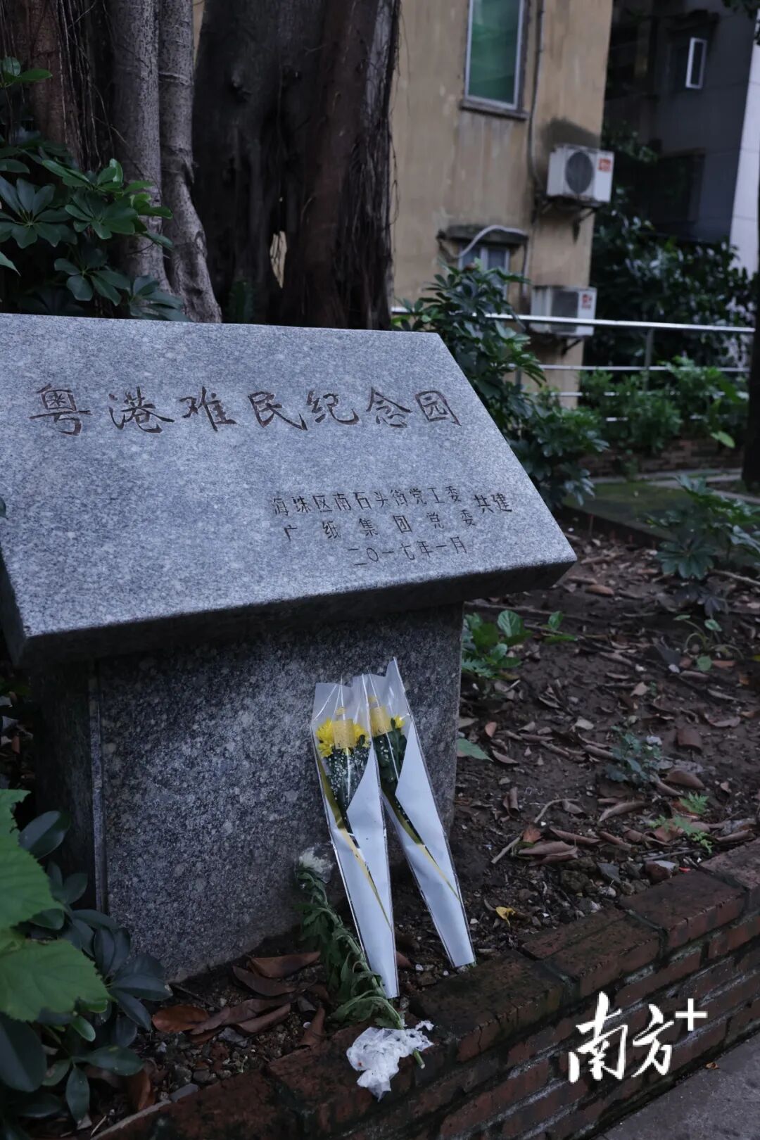 2025年8月18日,广州海珠区南石头街道,一处寻常居民小区的角落,青灰色石碑静静矗立。碑上刻着6个字:“粤港难民之墓”。字迹已有些许风化,却依然清晰。碑前摆放着两束黄色的菊花,花瓣微垂,似在低语。