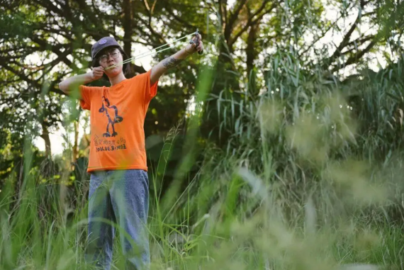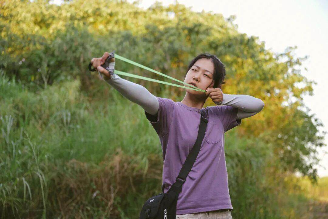 由2025“向山海走去”青年导演创作扶持计划(简称山海计划)十强导演侯眺执导的短片《练习弹弓的人》在广州杀青。影片中弹弓练习的外景地,最终选在了广州长洲岛江边一片尚未开发的荒地。从柏油路边沿向下行走约五十米,可见一处圆形草地,四周被各类茂密高大的绿色植物环绕。“站在角色身后观察她练习弹弓时,好像她已经与世隔绝;而置身其中向外望去,景深处是新造珠江特大桥巨大的斜拉结构和不息的车流,有一种和角色、情节高度契合的意境。”侯眺这样描述。