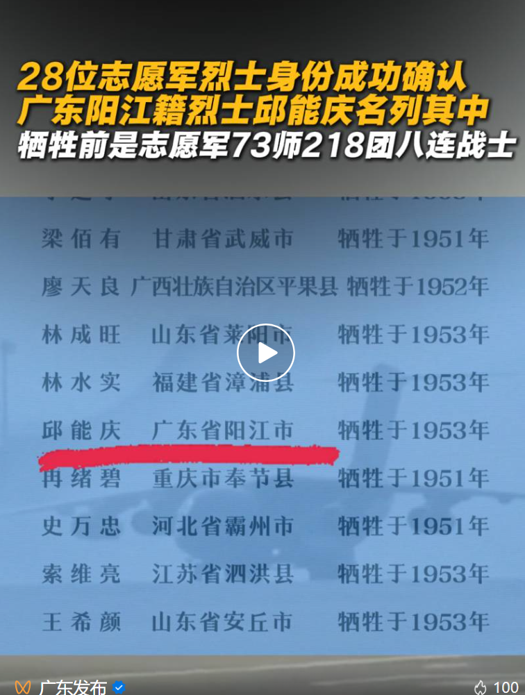 1953年7月10日,邱能庆在战斗中壮烈牺牲。牺牲前,他是志愿军七十三师二一八团八连战士——这些具体信息来自阳江市退役军人事务局,老人只记得父亲说过,邱能庆的军功章有很多,送到家里来,村人才知道他在朝鲜牺牲了。“已经知道了他安葬的地方,以后有机会的话会去看看他。”