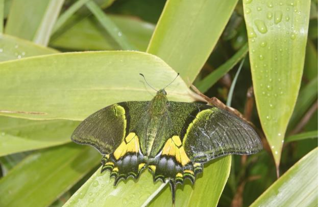 前翅金黄色斑带和后翅中央金黄色斑纹交相辉映,尾状突出细长且末端金黄,飞行时姿态优美灵动……近日,广州市流溪河国家森林公园在生物多样性专项调查团队于园内首次观测并记录到国家一级保护野生动物金斑喙凤蝶的活动踪迹。