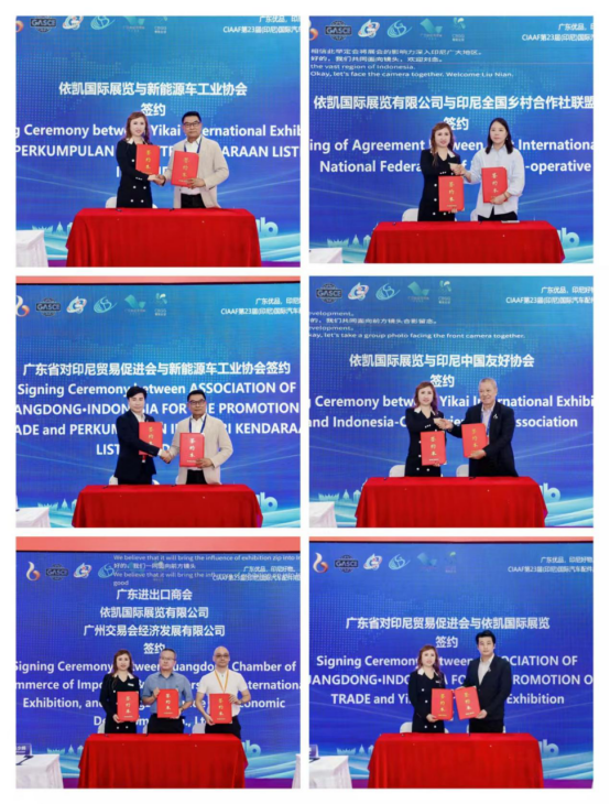 签约仪式成为发布会焦点。现场共完成九项重要签约,涵盖协会合作、资源对接与国际拓展等多个维度。作为发布会核心,依凯国际展览分别与印尼全国乡村合作社联盟、新能源车工业协会、印中友好协会、广东省对印尼贸易促进会等机构达成战略合作。尤为重要的是,依凯国际与广东进出口商会、广州交易会经济发展有限公司完成三方签约,进一步增强了第23届CIAAF印尼展在华南地区的组织与资源整合能力,显著提升展会的号召力与国际影响力,为中印尼企业共建汽车产业链、拓展合作机遇提供坚实支持。