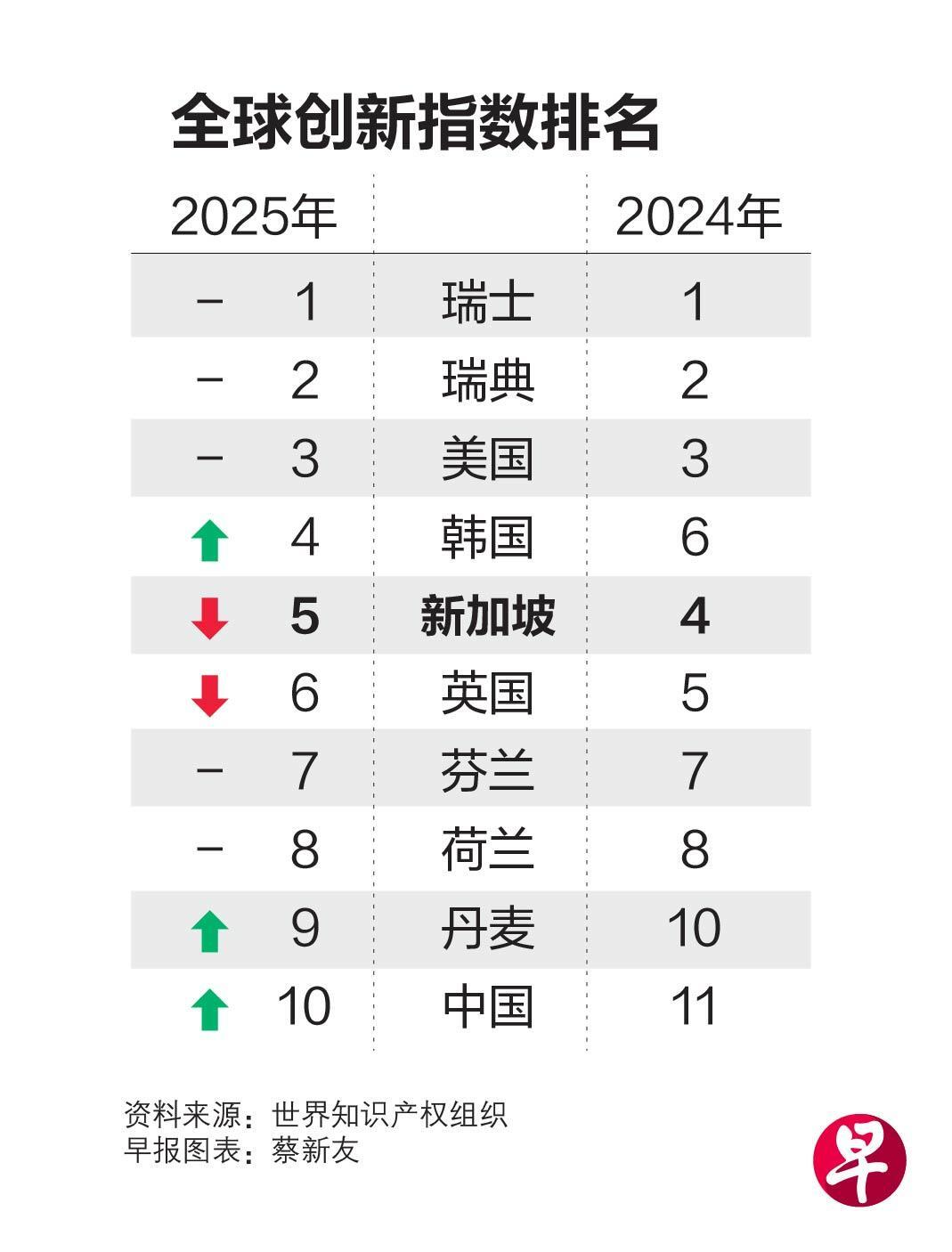世界知识产权组织(World Intellectual Property Organisation,简称WIPO)9月16日发布2025年全球创新指数(Global Innovation Index)。瑞士、瑞典和美国依旧依序拿下前三,韩国由去年的第六位,超越新加坡及英国,排名第四。中国则以全球中等收入经济体之姿,首次晋身10大,排在第10位。