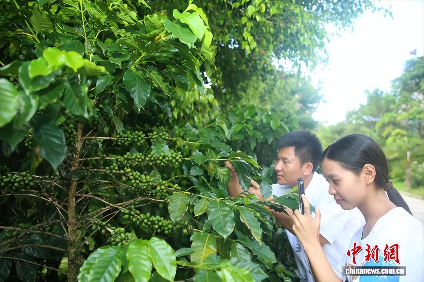 9月20日,缅甸留学生李文龙(左一)在咖啡庄园拍摄咖啡豆。黄兴鸿 摄