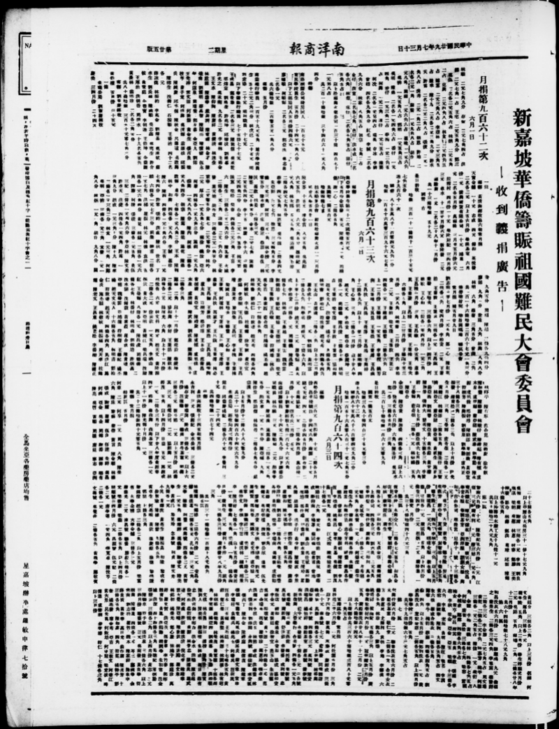1940年7月30日《南洋商报》,曾用2个整版记录星华筹赈会月捐、特捐九百余次中大量华侨姓名及捐款数额。