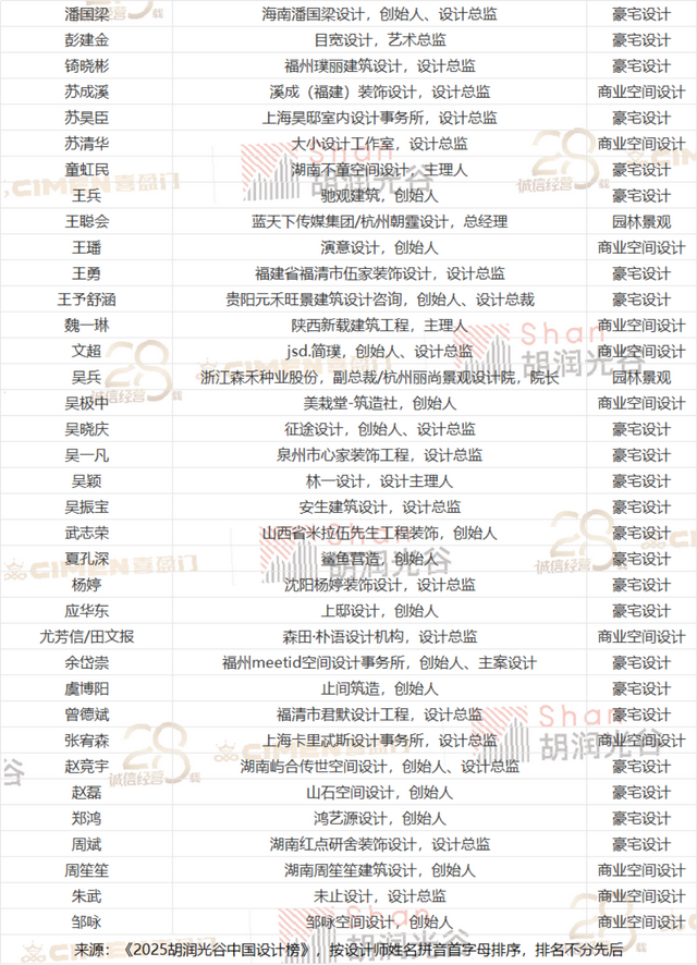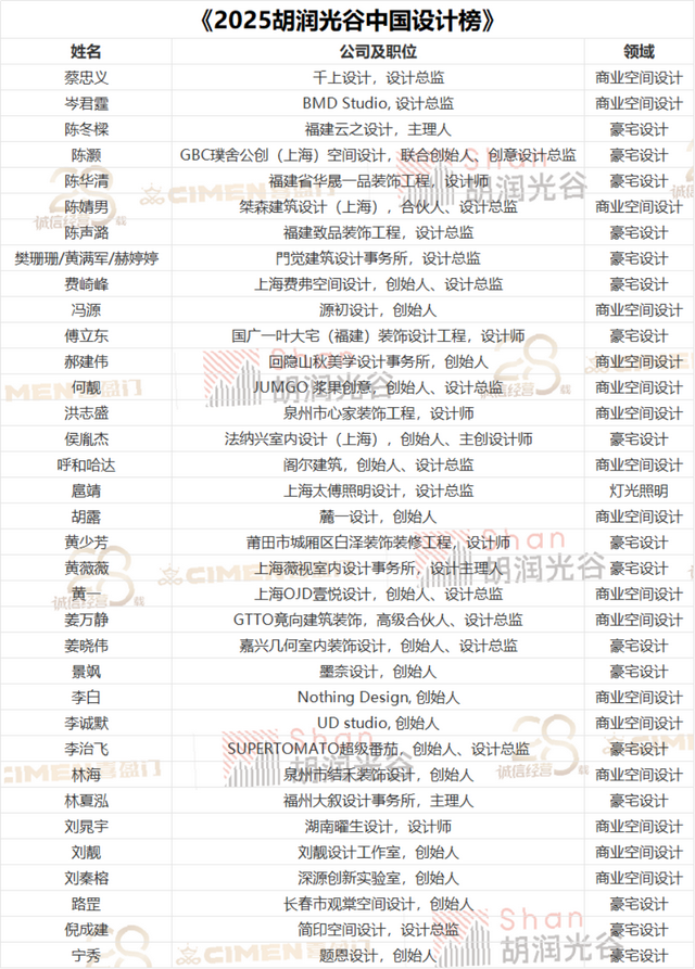《2025胡润光谷中国设计榜》通过设计作品的创新性、美学价值、可持续性和商业价值进行综合评选。共征集到逾百位设计师的申报材料,由知名设计师、跨界嘉宾、商业精英、KOL、企业家、艺术家组成的顾问评委团进行全面评审,最终71位设计师上榜,其中男性占84%,女性占16%。设计类别分布上,豪宅设计占6成,商业空间设计占4成。