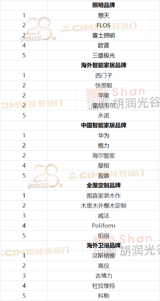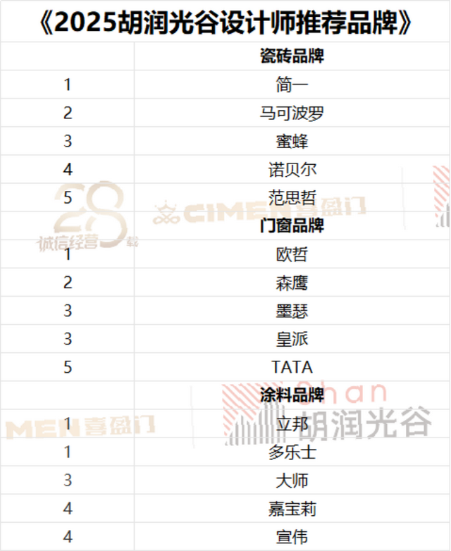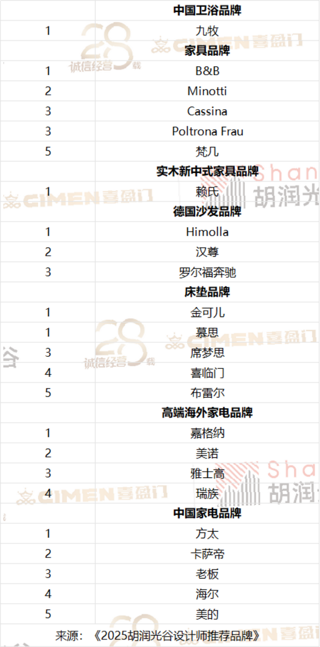 这次评选发布的子榜单《2025胡润光谷设计师推荐品牌》旨在通过专业视角甄选出2025年度兼具高品质与时代消费趋势的品牌代表。调研邀请近百位知名设计师,针对其熟悉的家装品类进行投票,征集他们心目中最推荐的品牌。最终在硬装与软装两大板块共11个品类中,评选出各类别的Top5榜单及特色品牌。其中,硬装品类包括瓷砖、门窗、涂料、照明、智能家居、全屋定制和卫浴;软装品类涵盖沙发、床垫、家具及家用电器。