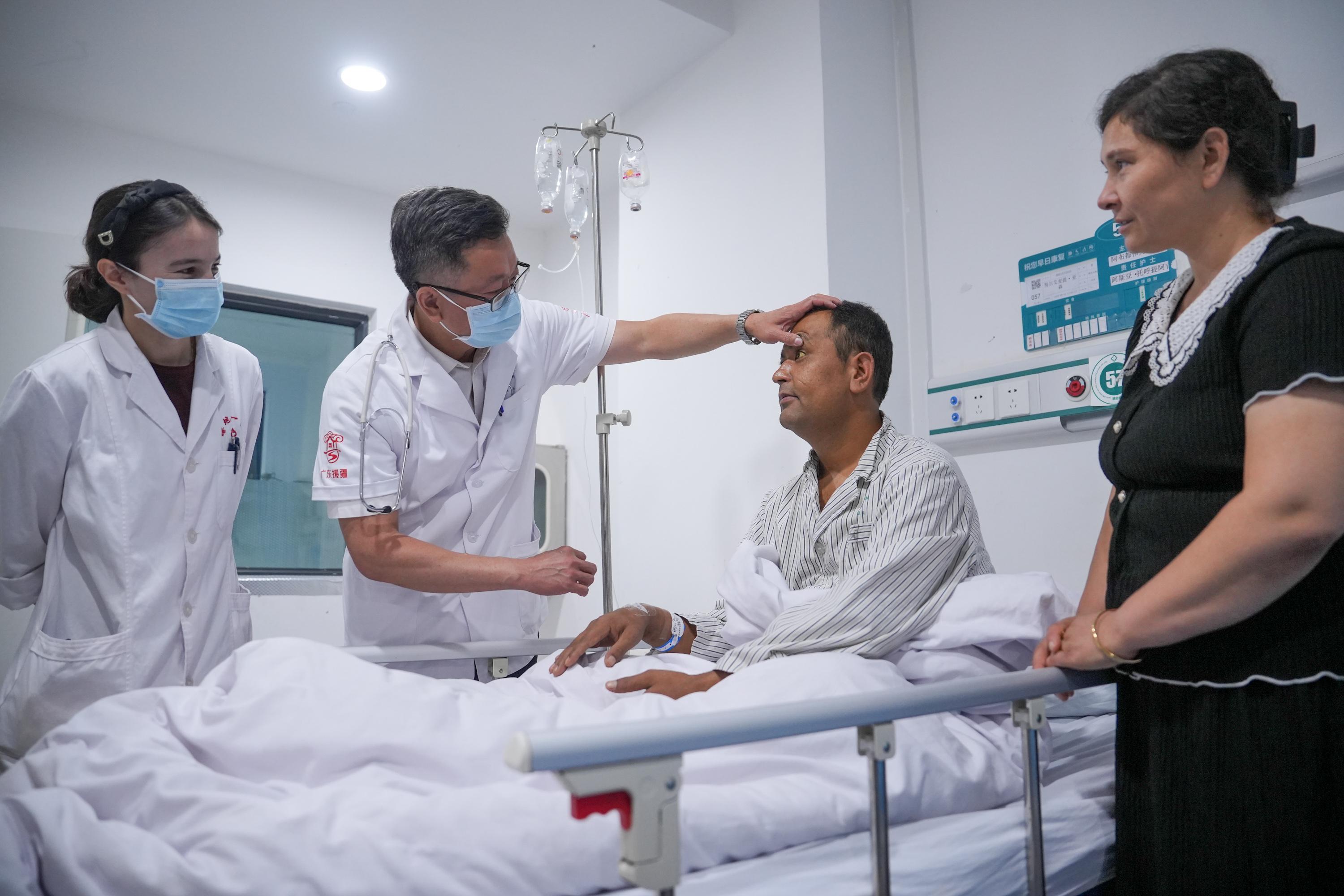 在中山大学附属喀什医院(国家区域医疗中心),援疆医生、感染科主任张绍全正带着感染科医生库尔班妮萨·吾拉音,为住院病人诊断病情。