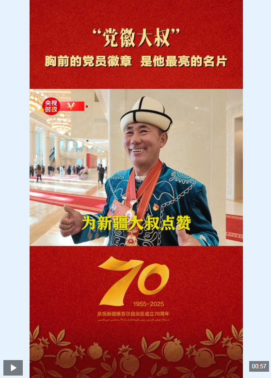 中國新聞亮點關注 独家视频丨“党徽大叔”胸前的党员徽章 是他最亮的名片 2025 年 9 月 26 日 25日上午,新疆维吾尔自治区成立70周年庆祝大会在新疆人民会堂隆重举行。中共中央总书记、国家主席、中央军委主席习近平出席庆祝大会。 总台记者在现场见到了来参会的新疆克州阿克陶县木吉乡的先进模范阿布都加帕尔·猛德。几年前,阿布都加帕尔·猛德因一段视频而备受关注。视频中他帮助陷入泥潭的游客车辆脱困,游客提出给钱作为报酬,他谢绝了,并亮出胸前的党员徽章。他也因此被网友称为“党徽大叔”。 在接受采访时,他说作为一名党员,要感党恩、听党话、跟党走,为人民服务。