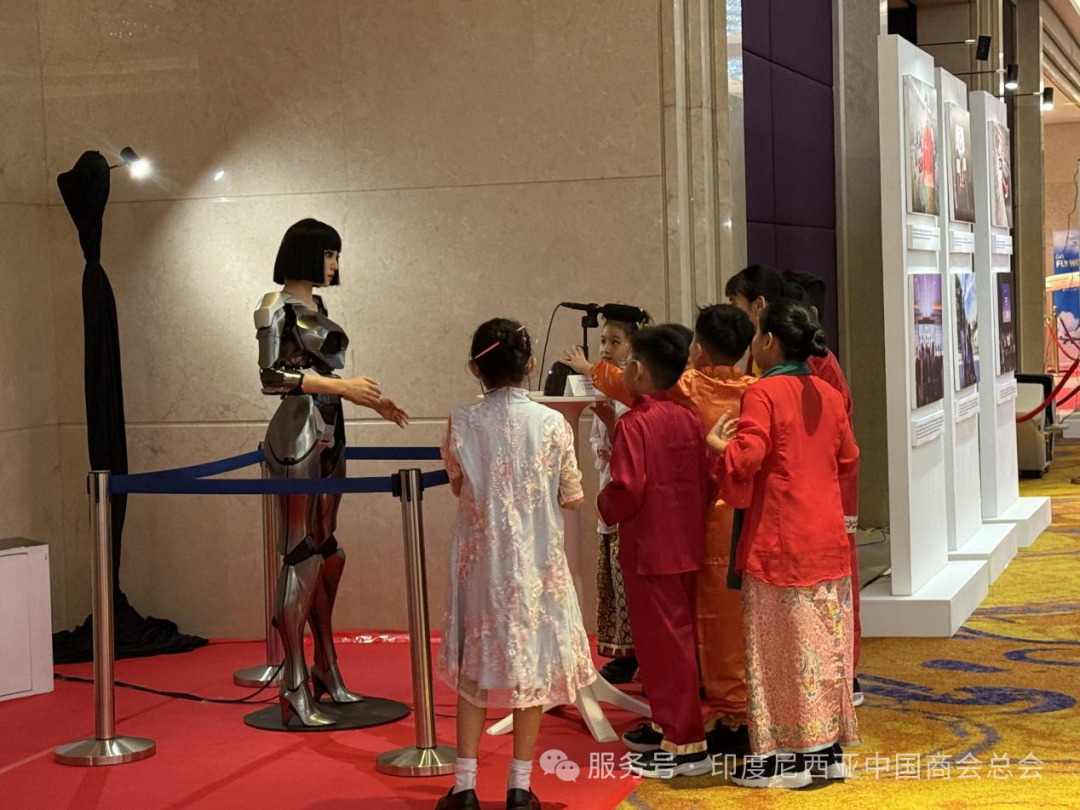 成果展设图文展板与实物展示区。图文展板以中印尼双语呈现,涵盖基础设施、数字经济、新能源等领域合作成果;实物展示包括中国移动机器人、华为新款手机、中兴裸眼3D设备、大疆无人机,另有华友工艺流程沙盘、雅万高铁模型、商飞 C909 模型等,直观体现中国企业技术实力与两国合作亮点。