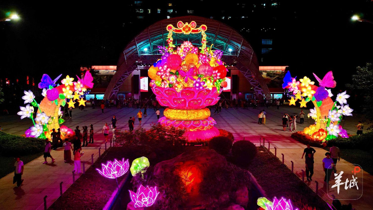 花篮之中,一朵朵绽放的牡丹、海棠、桂花层层叠叠,与鲜花相映成趣的,是篮中挂满的柿子、石榴、橙子、龙眼等瓜果造型彩灯,象征着秋天的丰收盛景,也寓意着全运会赛场上运动员们取得累累佳绩。