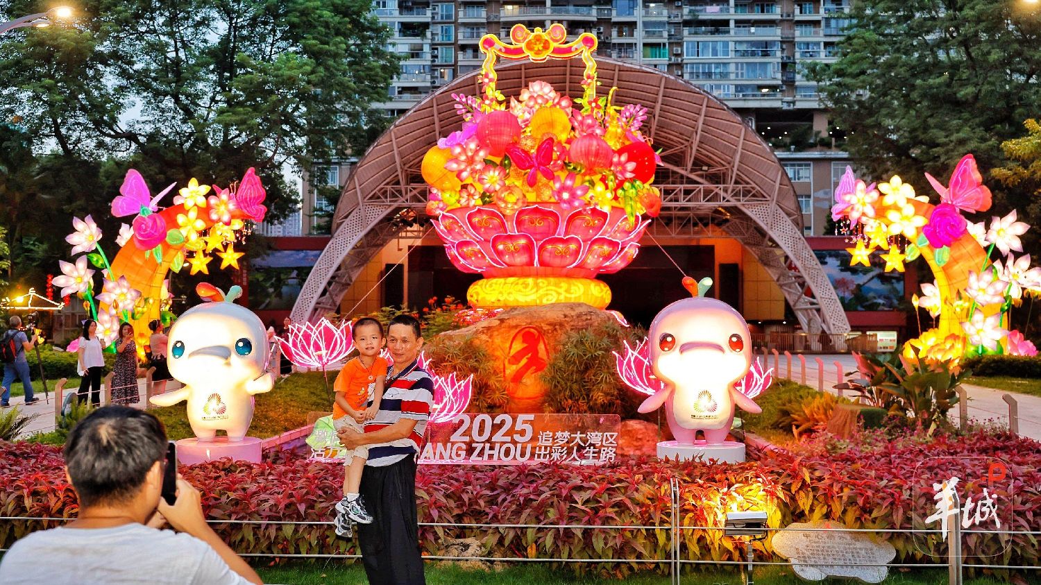 采用同样布展手法的灯组还有《花开映月耀湾区》《活力满溢》。其中,《花开映月耀湾区》花灯与大湾区景致相映成趣,而各地市花的融入让彩灯更添灵韵,澳门的莲花灯瓣层层叠展,深圳的簕杜鹃以紫红焰态绽放,中山的菊花雅致高洁。