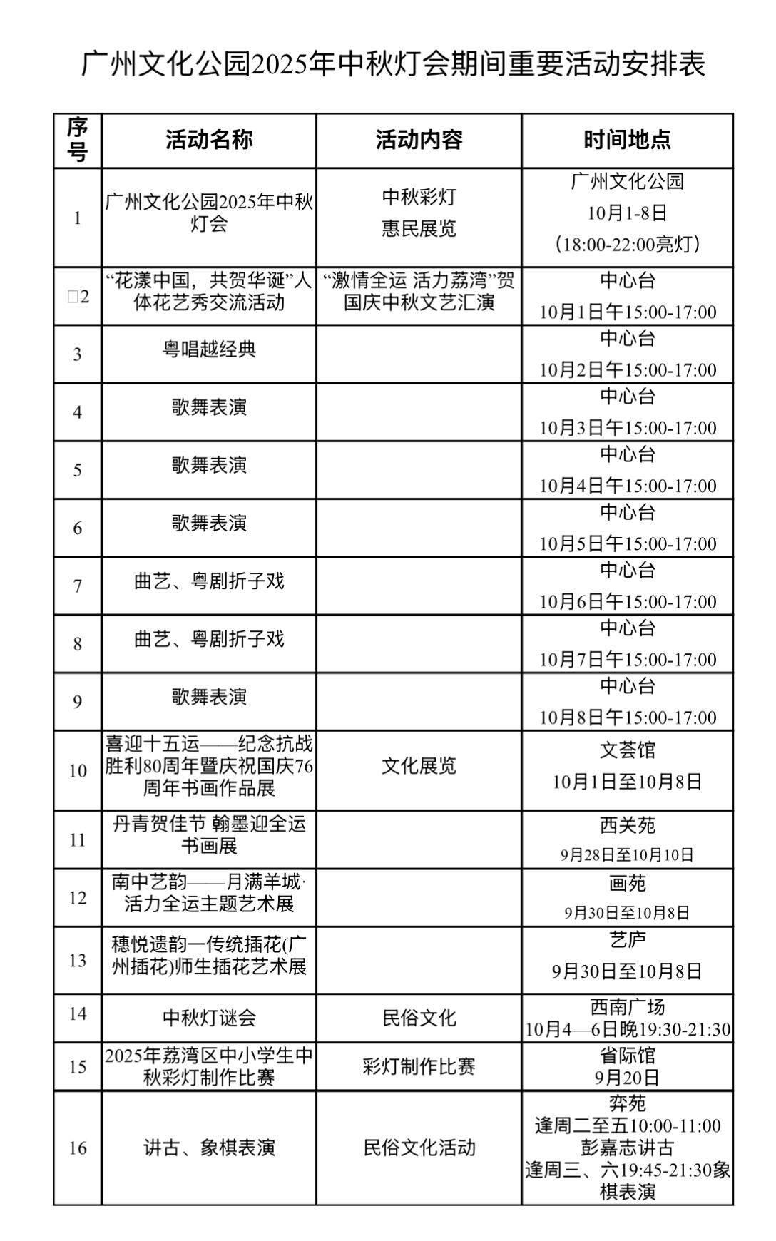 文化公园国庆中秋期间活动安排表通讯员提供