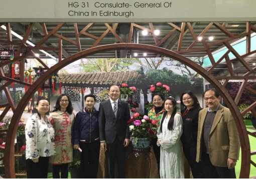 中国驻爱丁堡总领事潘新春夫妇参观了中国展台并看望了志愿者。潘总领事感谢侨社的积极参与和认真筹备,他表示,园艺展是传播中华文化、促进中国与苏格兰双方文化交流的良好平台,中国展台新意辈出,今年的牡丹展示一大亮点,展现了卓然超凡的中国之美。